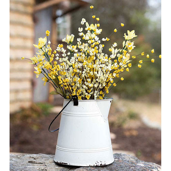 7 1/2"W x 8"H - Enamelware look finish with metal handle. Not guaranteed watertight. Flowers not included.